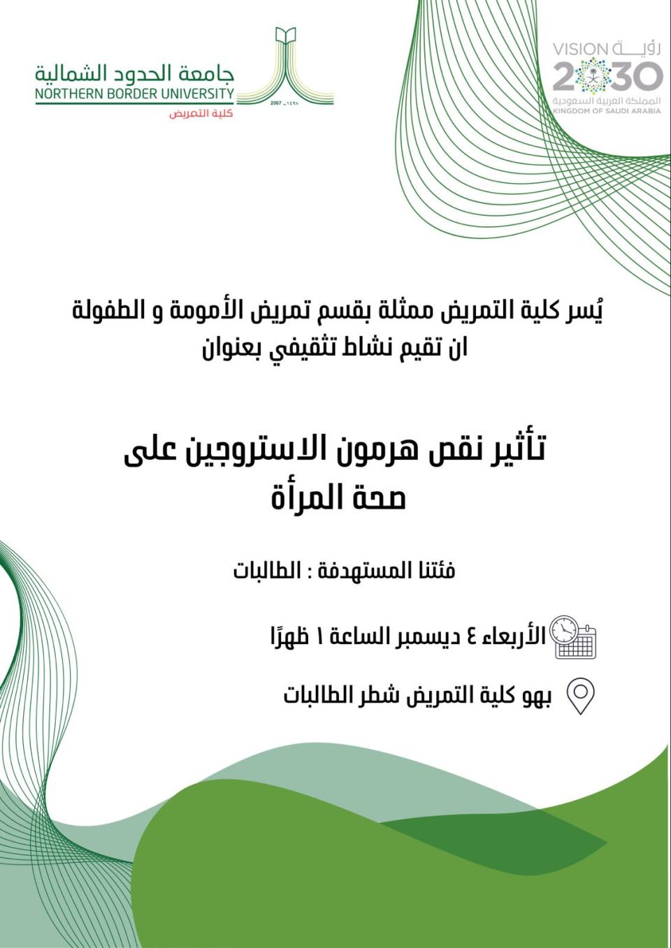 قامت كلية التمريض ممثلة بقسم تمريض الامومة والطفولة نشاط تثقيفي بعنوان تأثير نقص هرمون الاستروجين على صحة المرأة حيث يستهدف النشاط طالبات الكلية لتوعيتهم وتثقيفهم